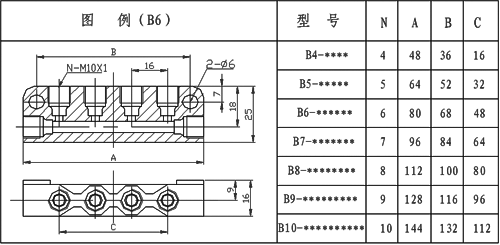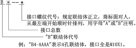 B型聯(lián)接體是用于安裝PD型抵抗式分配器和主油管路的連接,根據(jù)潤(rùn)滑系統(tǒng)的實(shí)際需要可任意并聯(lián)或串聯(lián)使用。每個(gè)接口的聯(lián)結(jié)螺紋有:M8X1(用B表示)和M10X1(用A表示),如聯(lián)接體有多余的接口,可用DTK-10堵頭將其封閉。連接管路時(shí)應(yīng)與KT 型卡套、KM型空心帽配合使用(若主管路為軟管時(shí)則需加CT型襯套)。 型號(hào)編制說(shuō)明