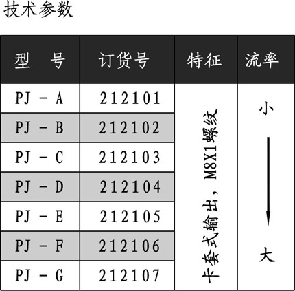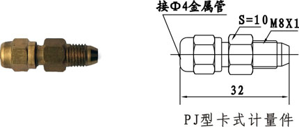 "P"系列抵抗式分配器又稱抵抗式計量件。為管式結(jié)構(gòu),輸出口接外徑Φ4油管,有卡套式和擴(kuò)口式兩種形式。它由單向閥和節(jié)流元件等組成。分配油量多少決定于計量件的流率及計量件兩端的壓力差。因此它能將油泵提供一定量的潤滑油按比例分配到各潤滑點。既可間歇工作,又可用于連續(xù)供油。計量精度低于容積式分配器。其中:PD型計量件連接螺紋為M10X1,PJ型計量件連接螺紋為M8X1。適用油液范圍:N22#-N68#潤滑油。