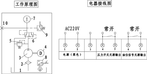 “CP”電動泵工作原理:電機(jī)4得電,驅(qū)動齒輪泵3運(yùn)轉(zhuǎn).通過吸油濾網(wǎng)2從油箱1吸入潤滑油,經(jīng)自動換向閥6壓送至輸出口10輸往系統(tǒng)。電機(jī)失電,停止泵油。換向閥6在差壓信號的作用下恢復(fù)至左位機(jī)能,溝通主管路卸荷通道。系統(tǒng)壓力經(jīng)自動換向閥6快速卸荷到油箱.系統(tǒng)壓力由調(diào)壓閥5控制,壓力表7顯示。油位開關(guān)8和壓力開關(guān)9作為選配件。